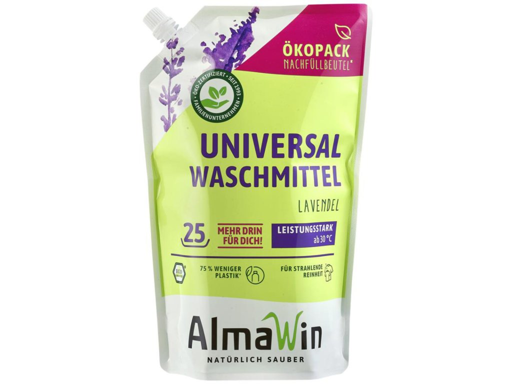 Univerzálny prací prostriedok AlmaWin s nádherne sviežou vôňou levandule je vhodný na všetky biele a farebné textílie, okrem vlny a hodvábu.